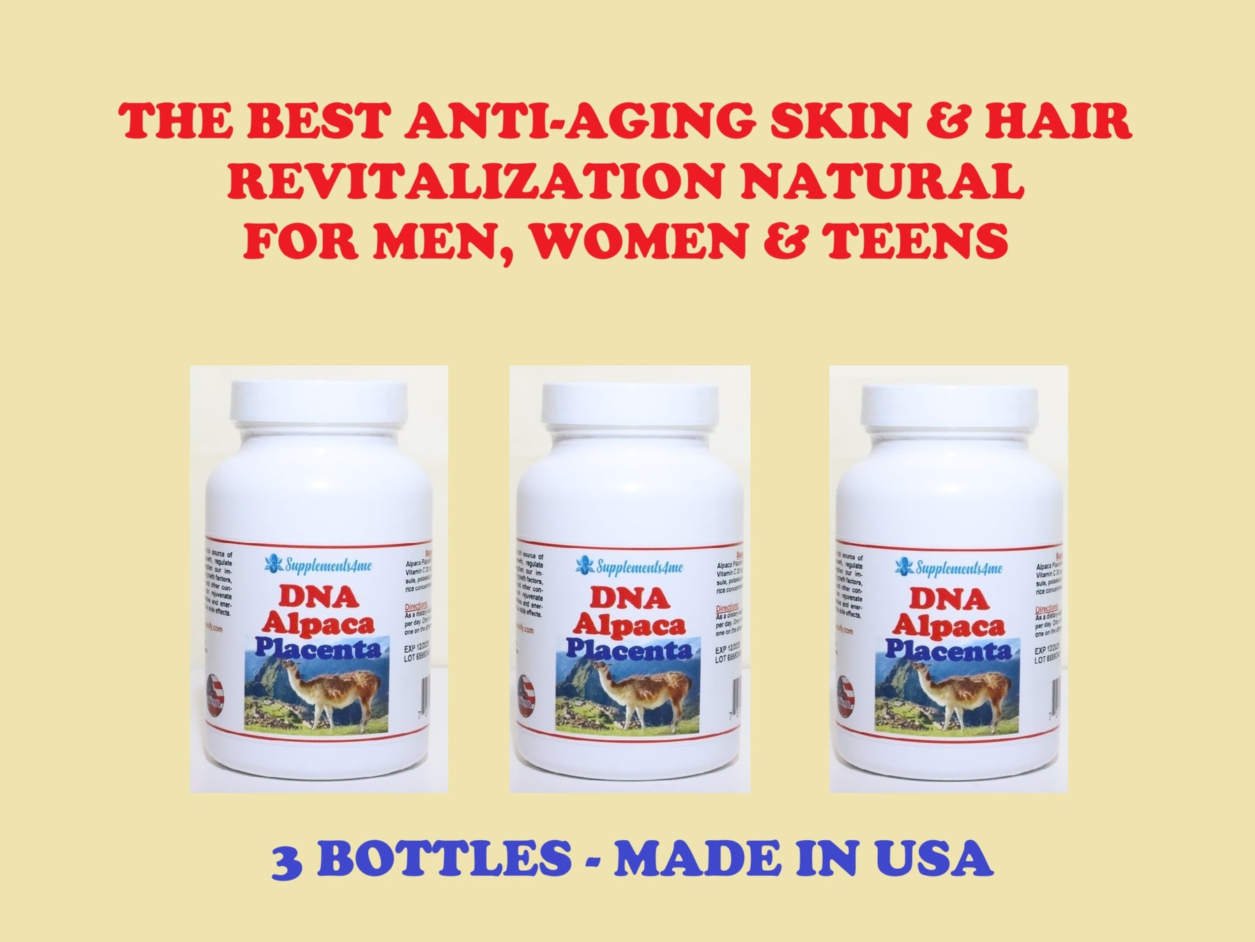 ANTI AGING FORMULA - ALPACA DNA PLACENTA - 3 BOTTLES - Made USA