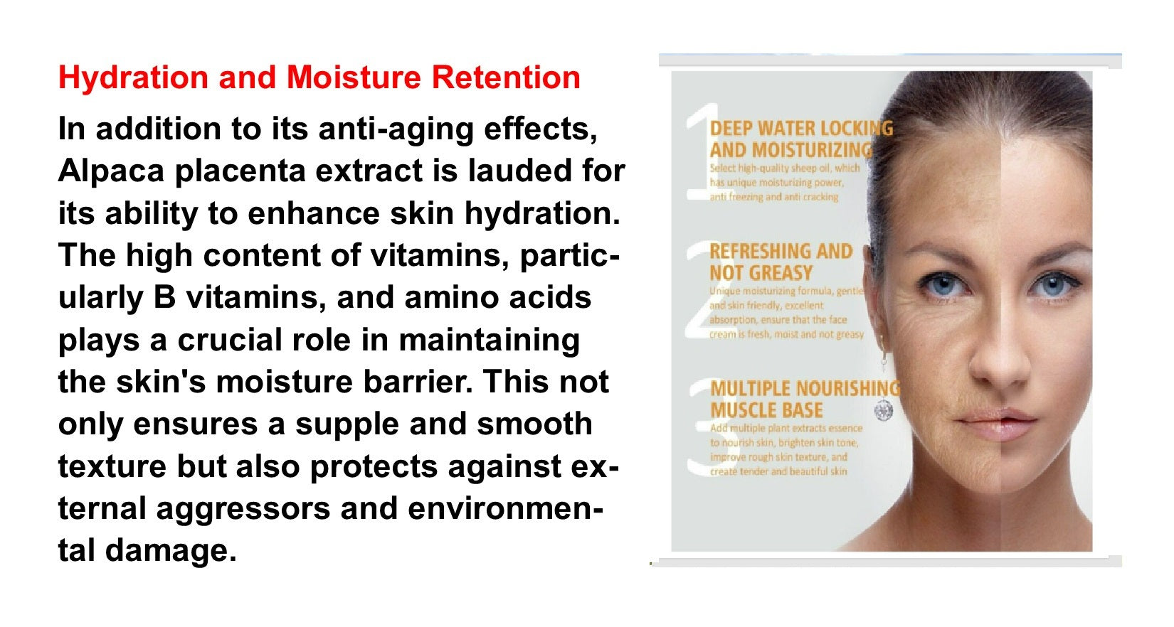 Alpaca Placenta is formulated using placenta extracted from Peruvian healthy Alpaca which is then freeze dried into powder. Studies have supported that Alpaca placenta is one of the richest source of nutrients in the world. Placenta is naturally loaded with minerals, antioxidants and amino acids that are naturally occurring as a result of the placenta protein. Alpaca Placenta restrains melanogenesis and activates your skin by accelerating the growth of cells.