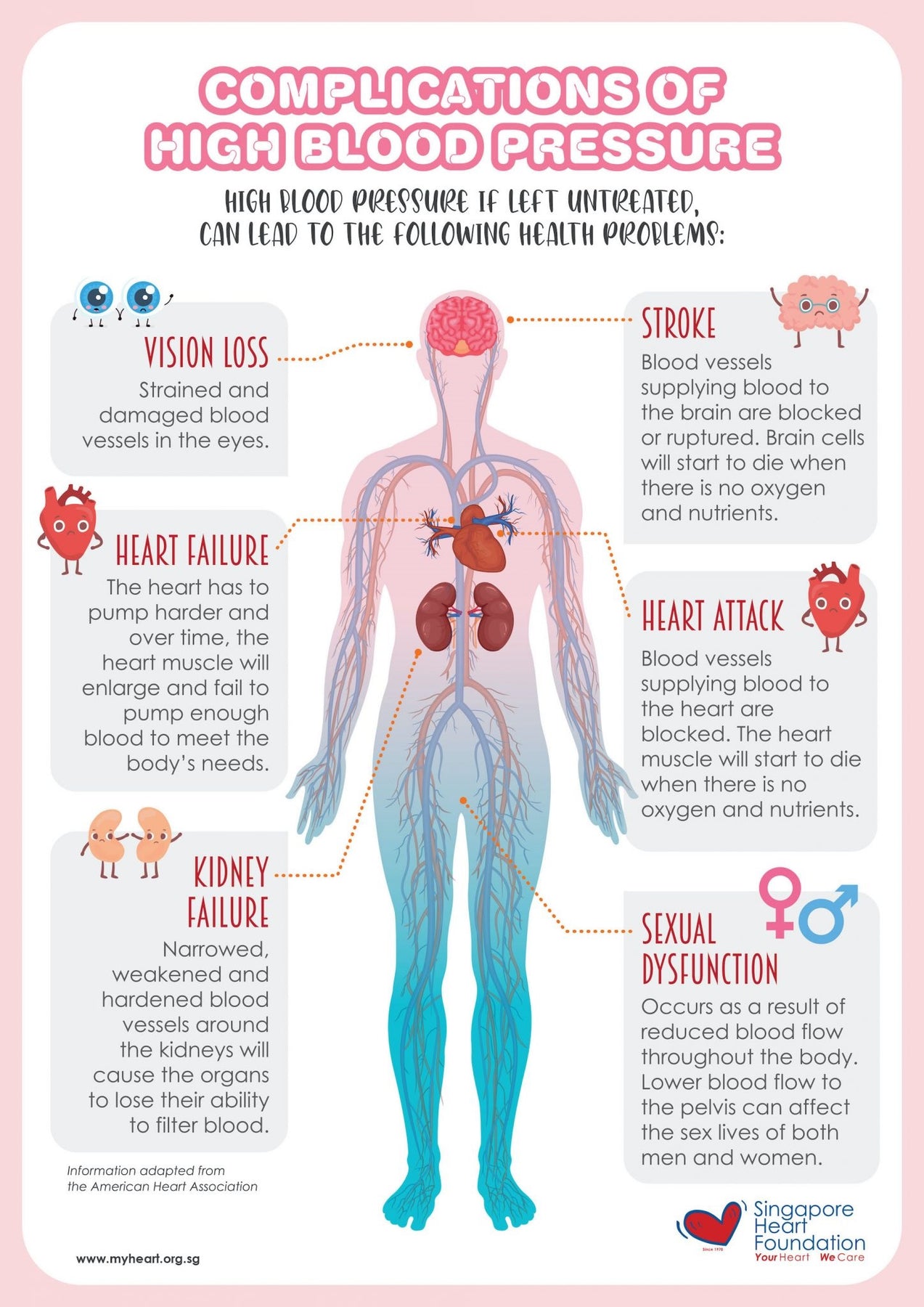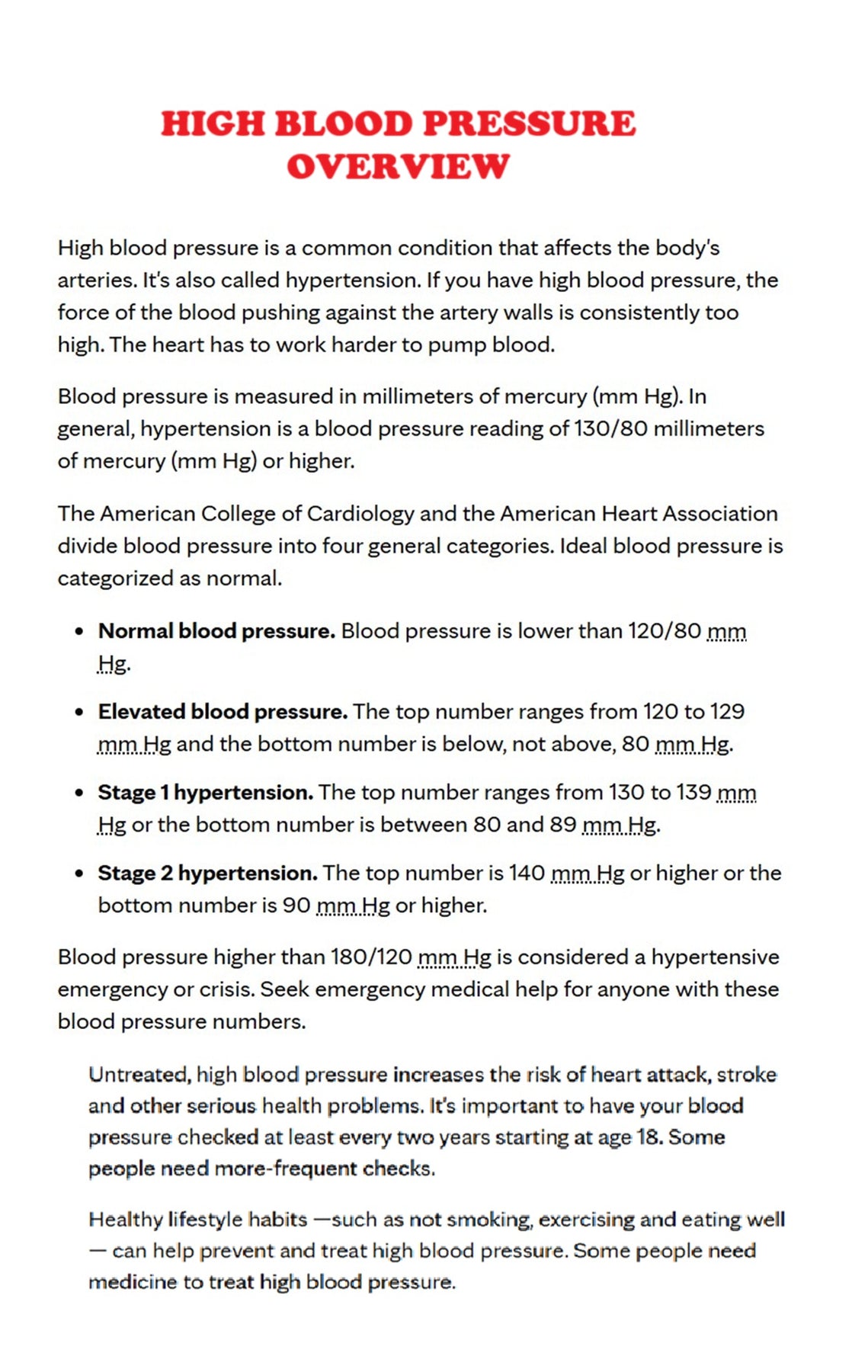 High blood pressure, also known as hypertension, is a condition where the force of blood against the artery walls is consistently too high. This can damage arteries and increase the risk of heart disease and stroke. While often asymptomatic, very high blood pressure can cause symptoms like headaches, chest pain, or dizziness. It's often called the "silent killer" because it usually doesn't have any noticeable symptoms.