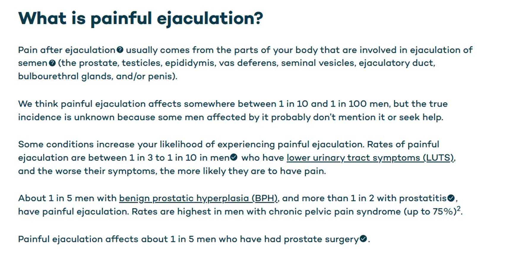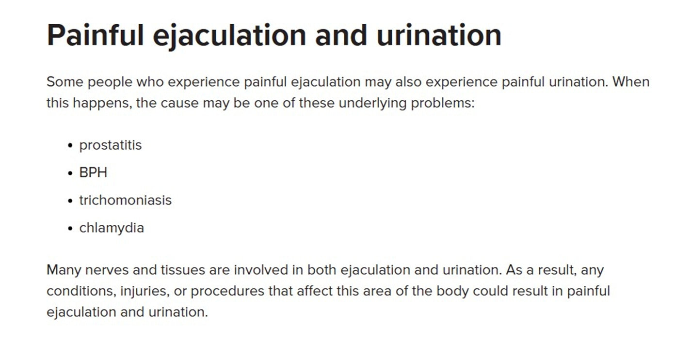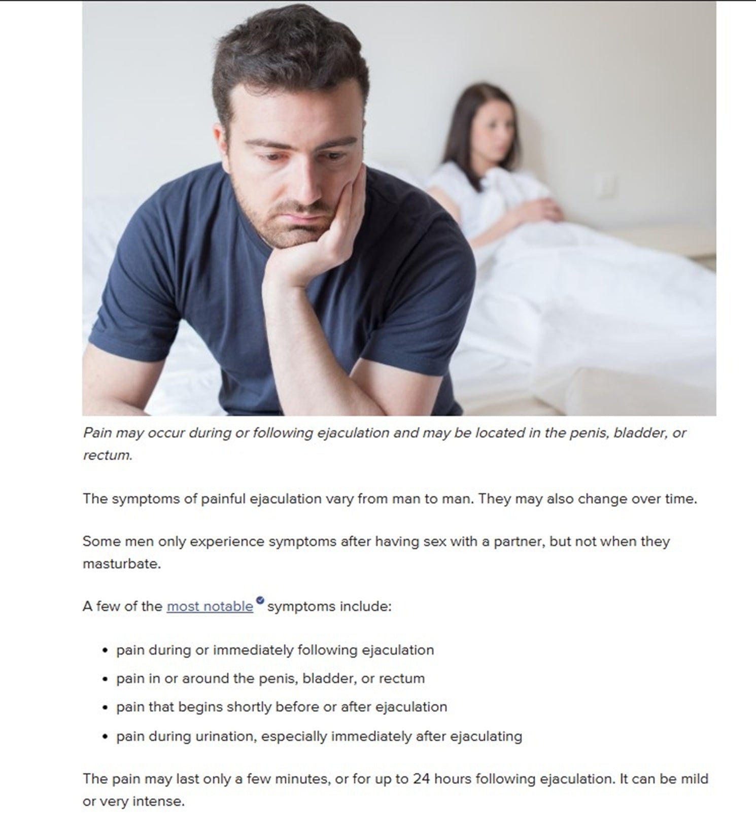 The symptoms of painful ejaculation vary from man to man. They may also change over time. Some men only experience symptoms after having sex with a partner, but not when they masturbate. A few of the most notable Trusted Source symptoms include: pain during or immediately following ejaculation. pain in or around the penis, bladder, or rectum. pain that begins shortly before or after ejaculation. pain during urination, especially immediately after ejaculating