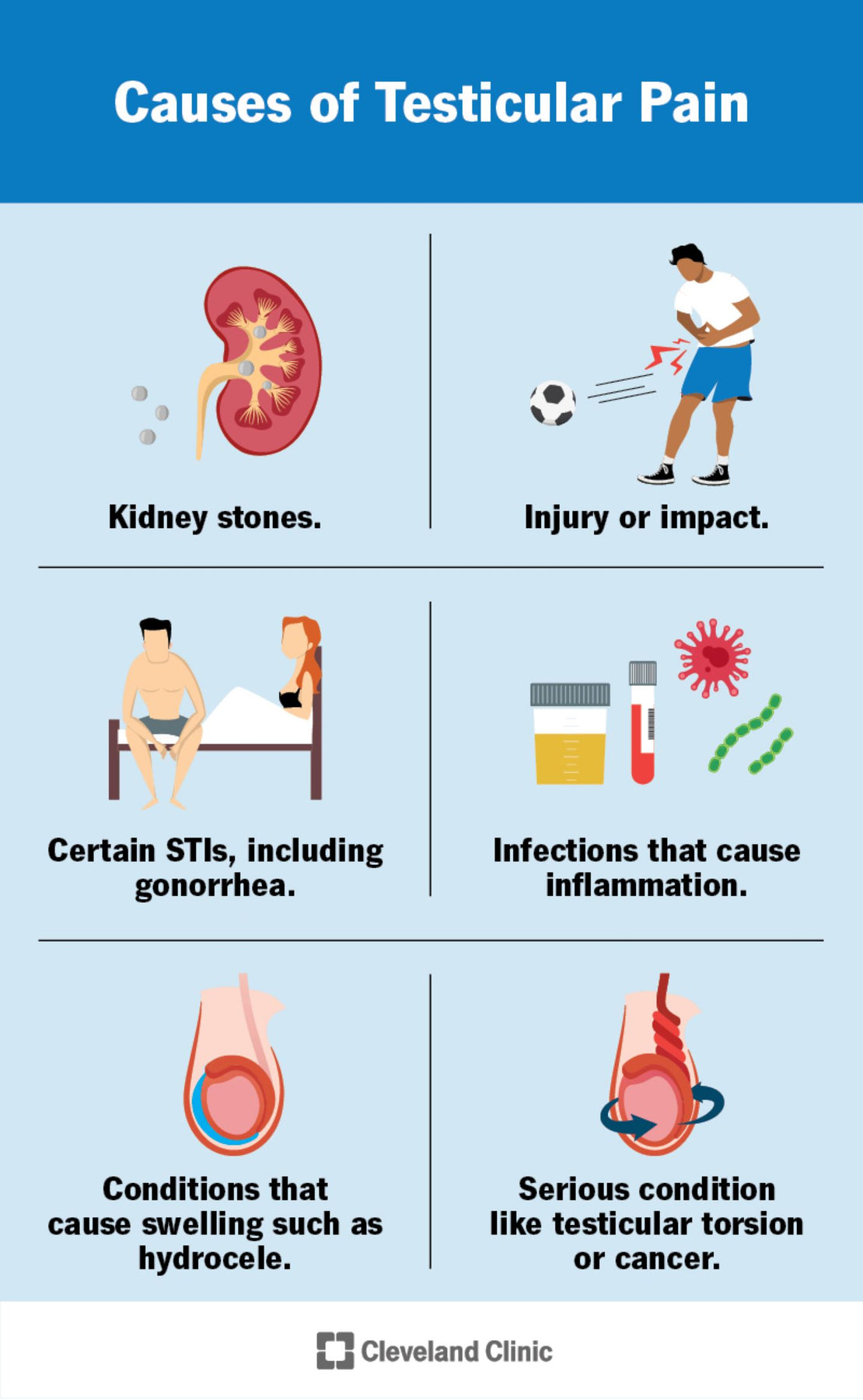 Common causes of testicular pain include: Injury; Infection or swelling of the sperm ducts (epididymitis) or testicles (orchitis); Torsion of the testicles, which can cut off the blood supply (testicular torsion).